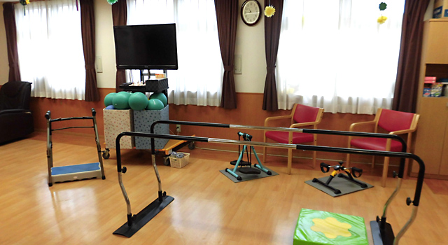 機能訓練は、ご利用者様の日常生活における生活機能の維持・向上を図ることを目的として行います。要介護1以上の認定の方には「個別機能訓練」を要支援認定の方には「運動機能向上」とそれぞれのメニューでの対応をいたします。訓練に入る前に機能訓練指導員と生活相談員が、ご利用者様の日々の生活状況を把握しどのような機能訓練を行うべきか、個別に評価を行い目標を設定し訓練計画をたてます。機能訓練指導員と介護職員が立会い安全に配慮しつつ機能訓練を行います。また、訓練内容を短期目標・長期目標それぞれにわけ、達成できたか否か評価を行います。